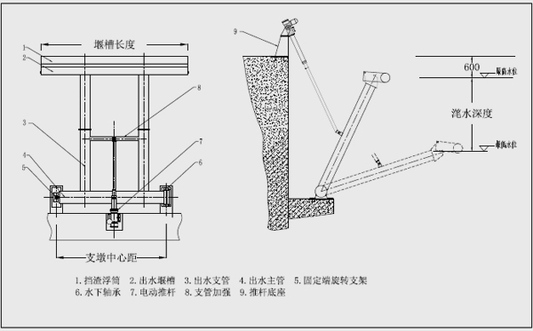 XB旋轉(zhuǎn)式潷水器是排出SBR反應(yīng)池中上清液的專用設(shè)備。旋轉(zhuǎn)式潷水器通過電動推桿的驅(qū)動,潷水堰槽繞排水管,實現(xiàn)潷水器連續(xù)排水。