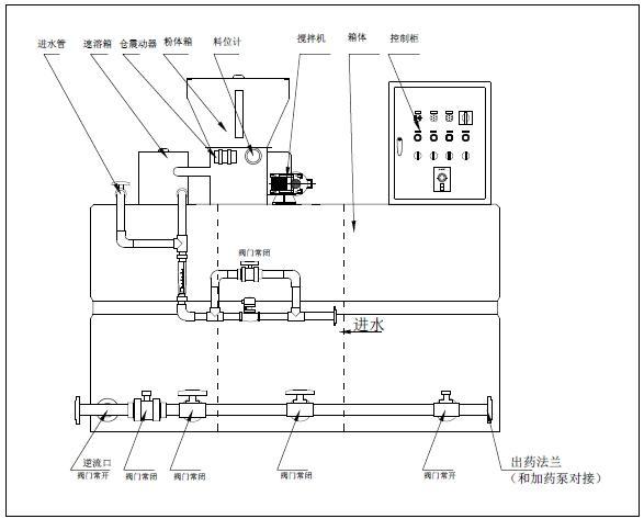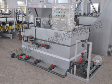 干粉絮凝劑從螺旋推進器內進入速溶器內與清水進行預混,被濕潤的物料進入配制槽進行攪拌稀釋,按要求濃度進行配制;配制過程中,進水量在流量計觀測下必須相對穩定,從而保證在整個工作工程中,配制溶液濃度不變。