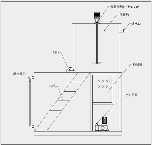 1、溶藥箱1臺 2、攪拌機1臺 3、存藥箱1臺 4、扶梯1臺 5、控制箱1臺 6、管道1套 7、磁力加藥泵1臺
