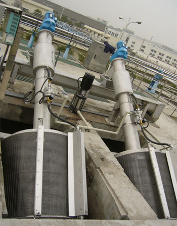 旋轉(zhuǎn)清污網(wǎng)筒在水中以35°傾角做每分鐘5~8r/min的圓周運(yùn)動(dòng),網(wǎng)筒的1/3浸沒在水中。污水及漂浮物從網(wǎng)筒下口進(jìn)入網(wǎng)筒內(nèi)部,漂浮物附著于網(wǎng)筒內(nèi)壁從水中帶出,當(dāng)網(wǎng)筒轉(zhuǎn)到高點(diǎn),雜質(zhì)由于重力作用掉入垃圾輸送系統(tǒng),經(jīng)輸送壓榨至出料口。被過濾的污水經(jīng)過網(wǎng)筒間隙流走。